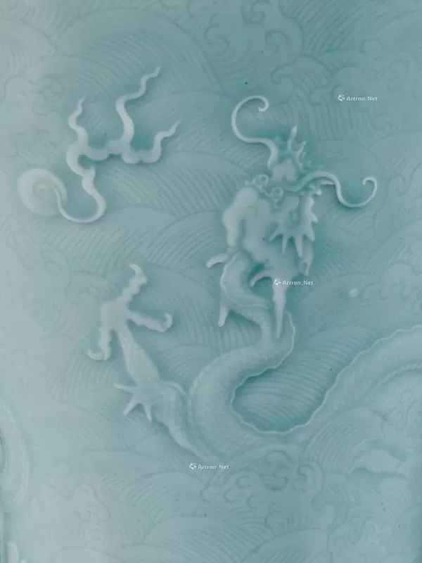 青釉溫潤,線條流麗,浮雕海水龍紋,傲顯天威,展現(xiàn)唐英督陶時期景德鎮(zhèn)御窯之精制妙造、雅致大方。唐英十六歲入宮,雍、干兩朝期間在內(nèi)務(wù)府供職,涉獵清宮浩瀚庋藏,飽覽前朝經(jīng)典,秀穎聰慧,借鑒創(chuàng)新,恪盡職守以投圣意。此瓶精益求精,至臻大雅,處處展現(xiàn)雍正晚期至乾隆初年御瓷特色。