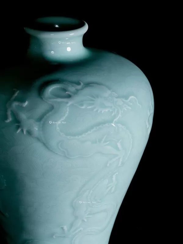 此梅瓶小口豐唇,寬肩斂腹,浮雕五龍,遨翔波濤海浪間,身披鱗片,爪趾或三或五,天威盡顯。一龍攀瓶而上,另見游龍兩兩相對,其中一側(cè)以蒼龍教子為題,肩上三爪巨龍,口含火珠,威風(fēng)凜凜,俯視五爪幼龍奪浪而出,寄寓孝賢之道。罩施青釉柔潤晶瑩,翠中泛藍,釉料隨雕刻起伏散聚,層次分明,靈動如生。底書青花六字篆款。