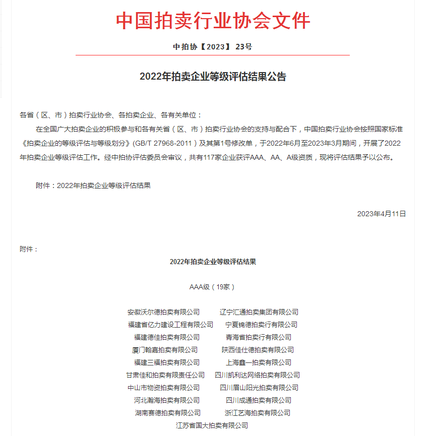 2023年4月,我公司被評(píng)為“中國(guó)拍賣行業(yè)AAA企業(yè)”。