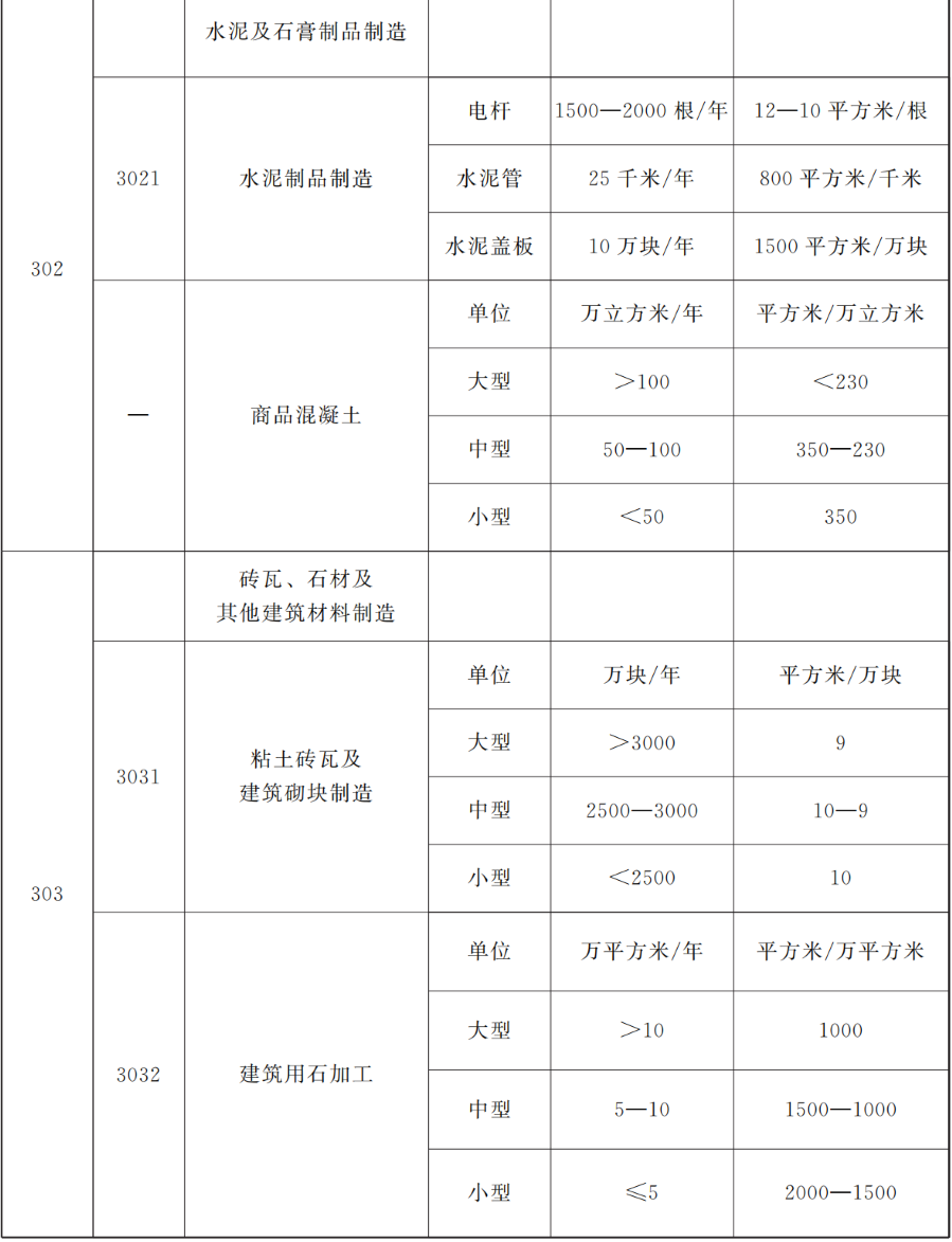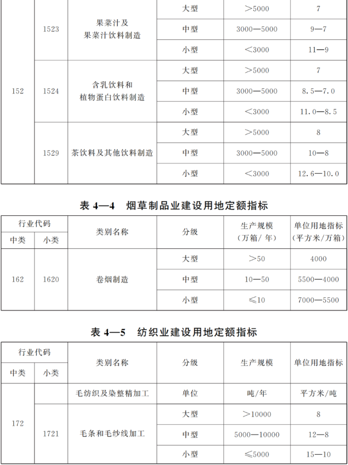 (二)工業(yè)行業(yè)分類代碼依據(jù)《國民經(jīng)濟(jì)行業(yè)分類》(GB/T4754—2017)中C類制造業(yè)門類下的13—43大類,共計31個行業(yè)。剔除我省未涉及的行業(yè)“21家具制造業(yè)”,共確定了30個行業(yè)的單位用地定額指標(biāo),將行業(yè)分類細(xì)化到三級類。定額指標(biāo)根據(jù)項目類型和生產(chǎn)規(guī)模規(guī)定了項目具體用地規(guī)模(詳見表4—1至4—30)。